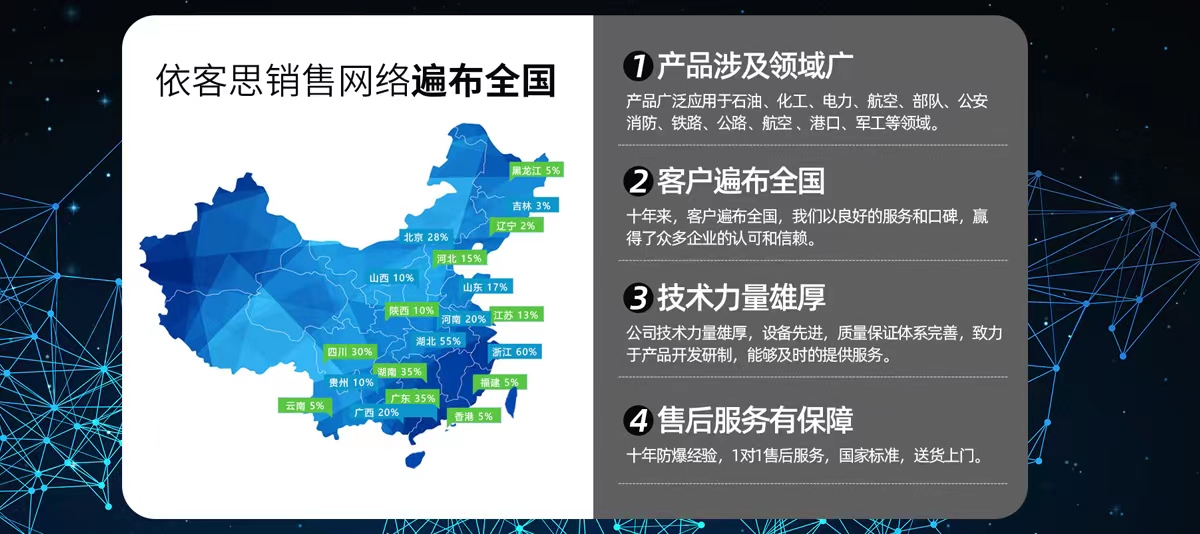 依客思防爆專注于防爆產品的研發、生產與銷售,主要產品有:防爆操作柱、BXCQ防爆靜電釋放儀、BZC系列防爆操作柱、不銹鋼現場操作箱、BXM(D)防爆照明(動力)配電箱、BXX防爆檢修箱、BXJ防爆接線箱、LED防爆燈、防爆管件、防爆風機等產品,型號規格齊全,廣泛適用于煤炭、電力、醫藥、石油、化工、航空等領域。我公司產品質量過硬,價格實惠,銷售范圍廣,且與各大型企業建立了良好的合作關系,同時還遠銷中、東亞和北美等地區,深受用戶喜愛與青睞。